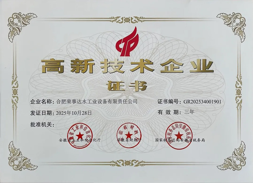合肥榮事達水工業設備有限責任公司通過高新技術企業認定,榮獲由...