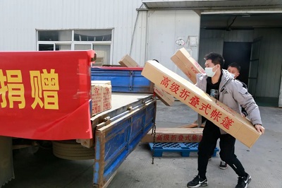榮事達水工業集團在得知消息后,第一時間聯系到主辦單位,向堅守在抗疫一線的工作人員送去滿載的蘇打水和帳篷,為奮戰在抗疫一線的工作人員提供后勤保障。