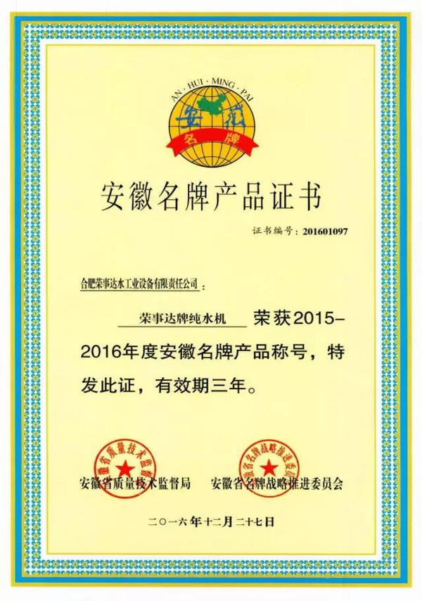 •        日前,安徽省質量技術監督局、安徽省名牌戰略推進委員會正式公示2015-2016年度安徽名牌產品榜單,合肥榮事達水工業設備有限責任公司申報的“榮事達牌純水機”產品榮列榜中,成為安徽凈水行業首家榮獲省級“名牌產品”稱號的企業,榮事達水工業公司強勁實力再次獲得政府和社會的充分肯定。