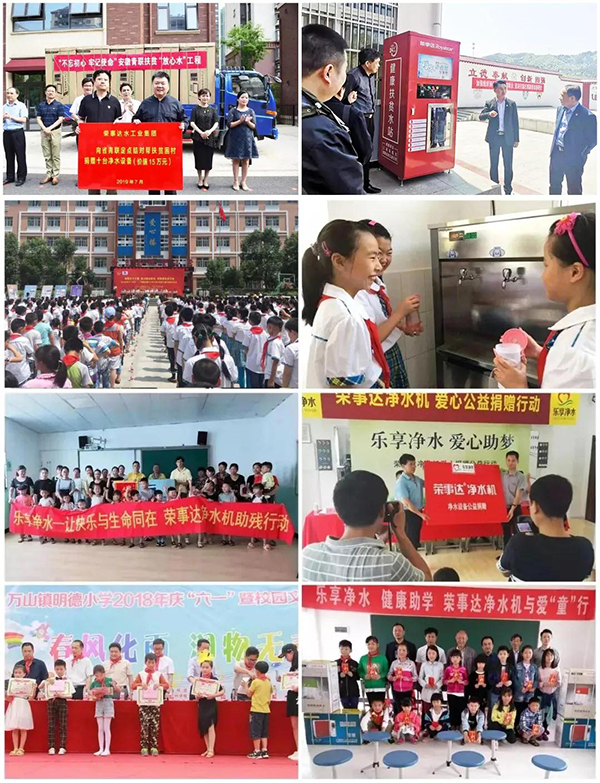 榮事達(dá)水工業(yè)從事凈水行業(yè)十余年,始終堅(jiān)守企業(yè)發(fā)展與公益事業(yè)同趨共行。榮事達(dá)自2010年發(fā)起“樂享凈水”公益行動(dòng),在全國范圍內(nèi)開展“健康助學(xué)”、“愛心助殘”、“愛心敬老”等各類公益幫扶,捐贈(zèng)、安裝凈水設(shè)備數(shù)千套;向全國首個(gè)希望小學(xué)——金寨希望小學(xué)捐贈(zèng)直飲水設(shè)備,并聯(lián)合金寨希望公益服務(wù)中心及地方公益協(xié)會(huì)共同發(fā)起“給山區(qū)孩子一杯水”——援建金寨中小學(xué)凈水設(shè)備公益活動(dòng),向金寨縣全縣中小學(xué)援建直飲水設(shè)備400多套,該項(xiàng)目也被評為“安徽省十佳學(xué)雷鋒志愿服務(wù)項(xiàng)目優(yōu)秀典型”;攜手中華少年兒童慈善救助基金會(huì)發(fā)起成立“健康飲水專項(xiàng)基金”,開展各類校園飲水健康保障工作;攜手安徽團(tuán)省委、省青聯(lián)啟動(dòng)“青力扶貧聯(lián)創(chuàng)夢想”健康扶貧“放心水”工程,向安徽地區(qū)多個(gè)貧困村捐贈(zèng)凈水設(shè)備,建立健康扶貧水站等。