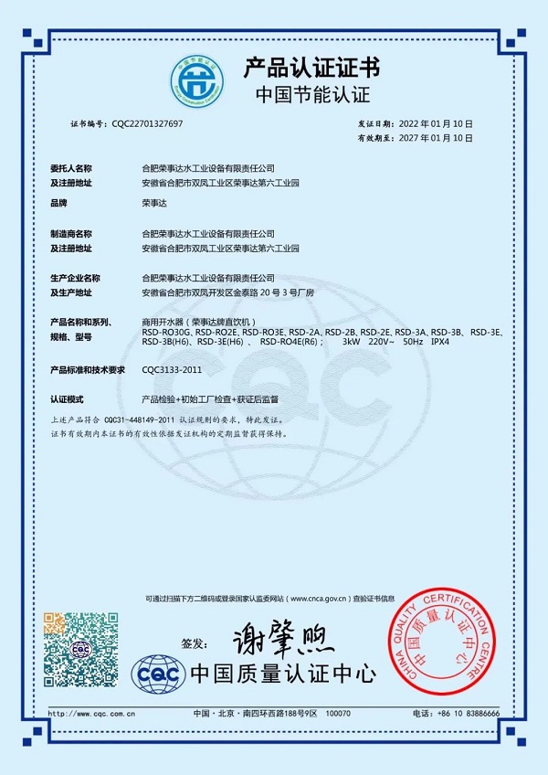 榮事達(dá)RSD-RO3E直飲機(jī)和榮事達(dá)RSD-RO2E幼兒園機(jī)均采用節(jié)能熱交換技術(shù),省時(shí)省電,實(shí)現(xiàn)了節(jié)能環(huán)保理念,獲得了中國節(jié)能認(rèn)證。