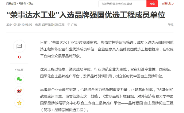 - 5月20日,發(fā)現(xiàn)品牌官網(wǎng)、品牌強(qiáng)國優(yōu)選工程官網(wǎng)、網(wǎng)易、今日頭條發(fā)表了“‘榮事達(dá)水工業(yè)’入選品牌強(qiáng)國優(yōu)選工程成員單位”的文章,文中肯定了榮事達(dá)水工業(yè)以創(chuàng)新為驅(qū)動,以綠色制造為己任,不僅深耕國內(nèi)市場,更在國際舞臺上展現(xiàn)中國制造的魅力的大作為、強(qiáng)擔(dān)當(dāng)。