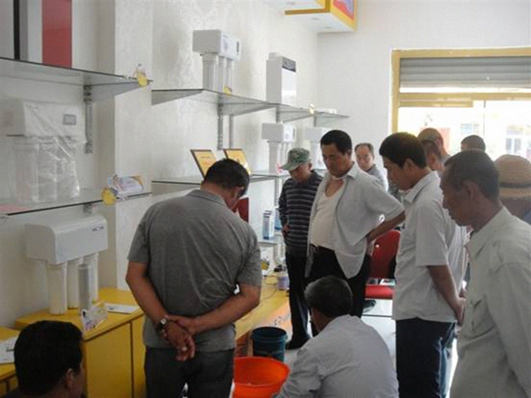 開業當天,整修一新的店中整齊擺放了純水機、管線機等產品以及各種榮譽資質證書。當地許多居民紛紛來到店中參觀機器,咨詢產品信息。店內開展的凈水實驗,吸引了眾人圍觀,他們一邊看一邊詢問機器工作原理,學習產品使用方法。
