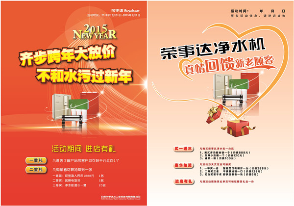 又至歲末,辭舊迎新,榮事達跨年獻禮,感恩回饋,再掀凈水狂潮。回首2014,居民飲水安全頻頻告急,安裝家用凈水機實現(xiàn)“純凈水自己造”,構(gòu)筑飲水安全最后一道防線,成為居民生活頭等大事。為普及凈水,元旦期間,榮事達將在全國多個省份推行惠民政策,加強推廣凈水機的力度。顧客在元旦期間進店選購榮事達凈水機,可獲得超值大禮。逛店拿紅包——顧客進店咨詢產(chǎn)品信息,即可獲贈千元紅包;購機送好禮——購買榮事達純水機,可獲贈管線機、凈洗機等精美大禮;歡樂抽大獎——顧客現(xiàn)場購機可參加抽獎活動,現(xiàn)金大獎、名牌家電、濾芯套裝等各項大獎送不停。開心跨年,悅享凈水。新的一年,榮事達凈水機將以更優(yōu)質(zhì)的產(chǎn)品、更好的服務加速凈水普及,真正讓惠于民,讓廣大消費者喝上安全、健康的好水,提高居民生活品質(zhì)。- [關(guān)閉] [打印]