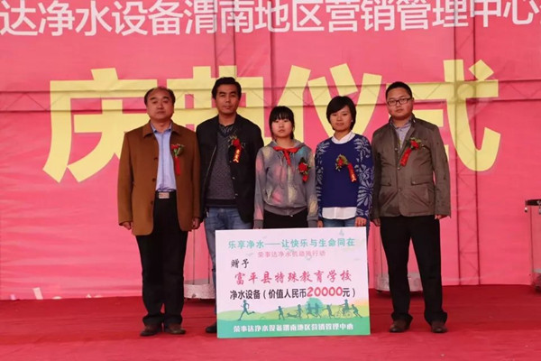 2015年伊始,榮事達水工業公司與安徽省青年志愿者協會共同發起了“樂享凈水——讓快樂與生命同在”助殘公益項目,活動一經發起就受到了各地代理商的積極響應,截止目前,累計向康復中心、特殊學校、助殘機構等350多個單位捐贈凈水設備2000多套,受惠人口超過50000人。除此之外,代理商們還主動為社會其他人群提供幫助,遼寧遼陽代理商就為當地環衛工人設置榮事達飲水站,解決其工作期間的飲水問題;江蘇大豐舉行了“關愛生命,凈享水源”百村助民活動,當地代理商依據實際情況為各村鎮服務機構安裝凈水機,方便村民接水飲用。